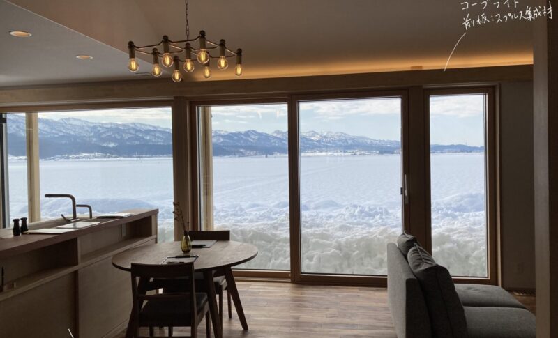 山々の稜線と雪原(水田)を見渡せる抜群の眺望。