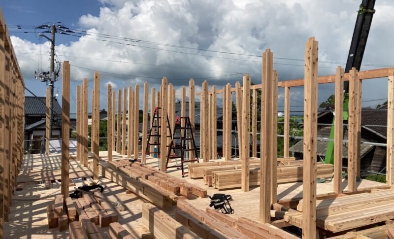 1階柱→1階梁→2階床下地構造用合板→2階柱が完了した状態。