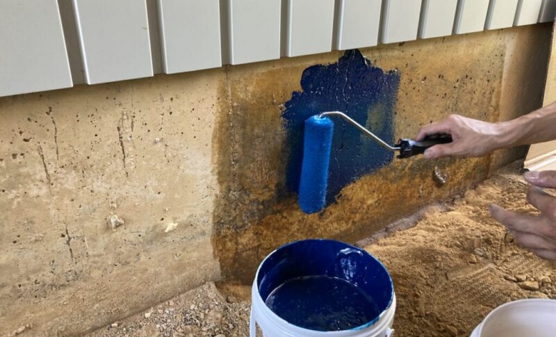 足場が外れたあとに基礎のひび割れ補強工事。補強には㈱日本衛生センター社の『ソリッドリメイン』を採用。