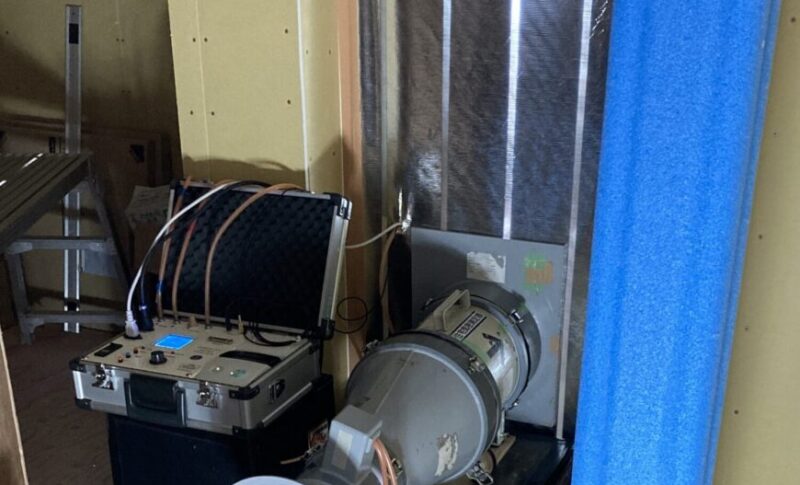 断熱材や窓、換気、電気工事の外配線が完了した時点で建物の隙間面積を計測する「気密測定」を実施しました。