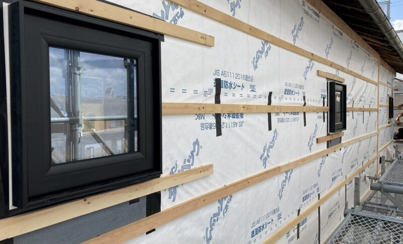 外張り断熱施工後、新しいサッシを設置。
