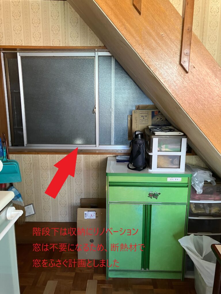 台所には階段があり、リフォーム後は階段下収納として利用する計画。窓は不要になるので、撤去することも考えましたが、コストや施工性も考慮して断熱材で窓をふさぐことにしました。
