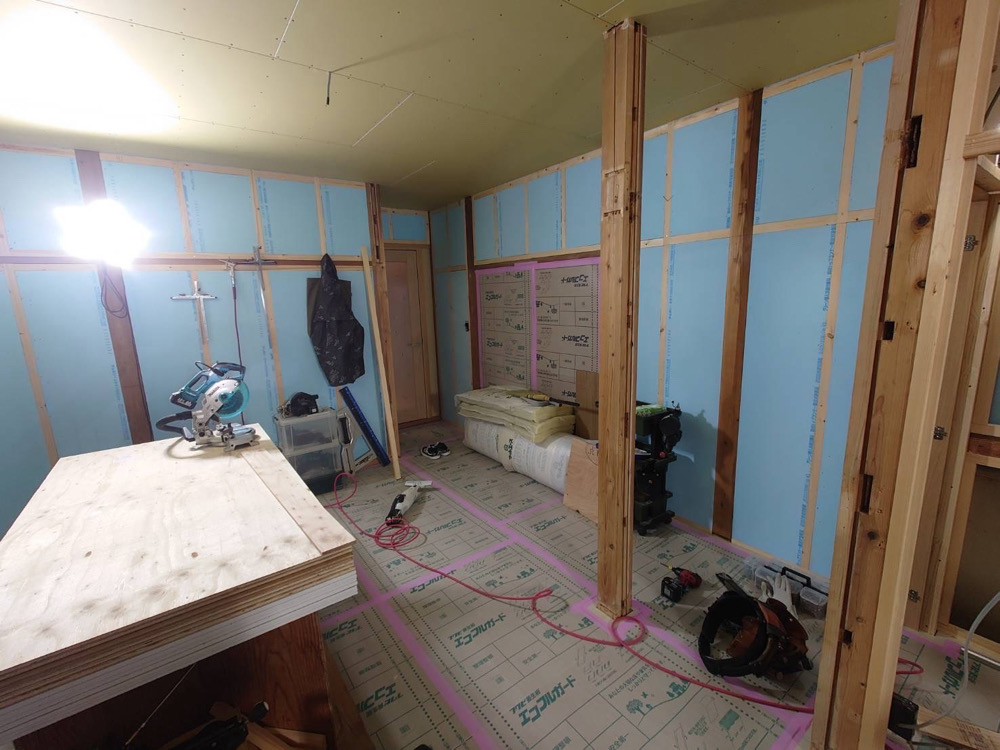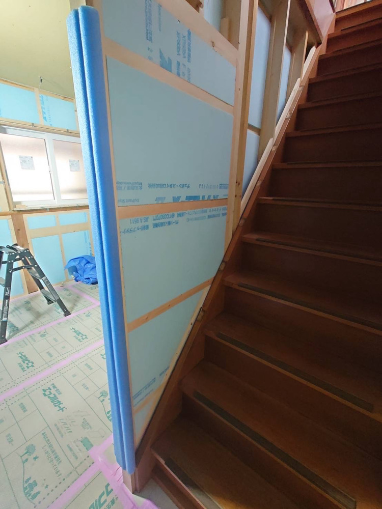 台所には階段があり、1、2階の暖冷気の通り道になっていました。新たに壁を設けて、そこにも断熱材を設置することに。