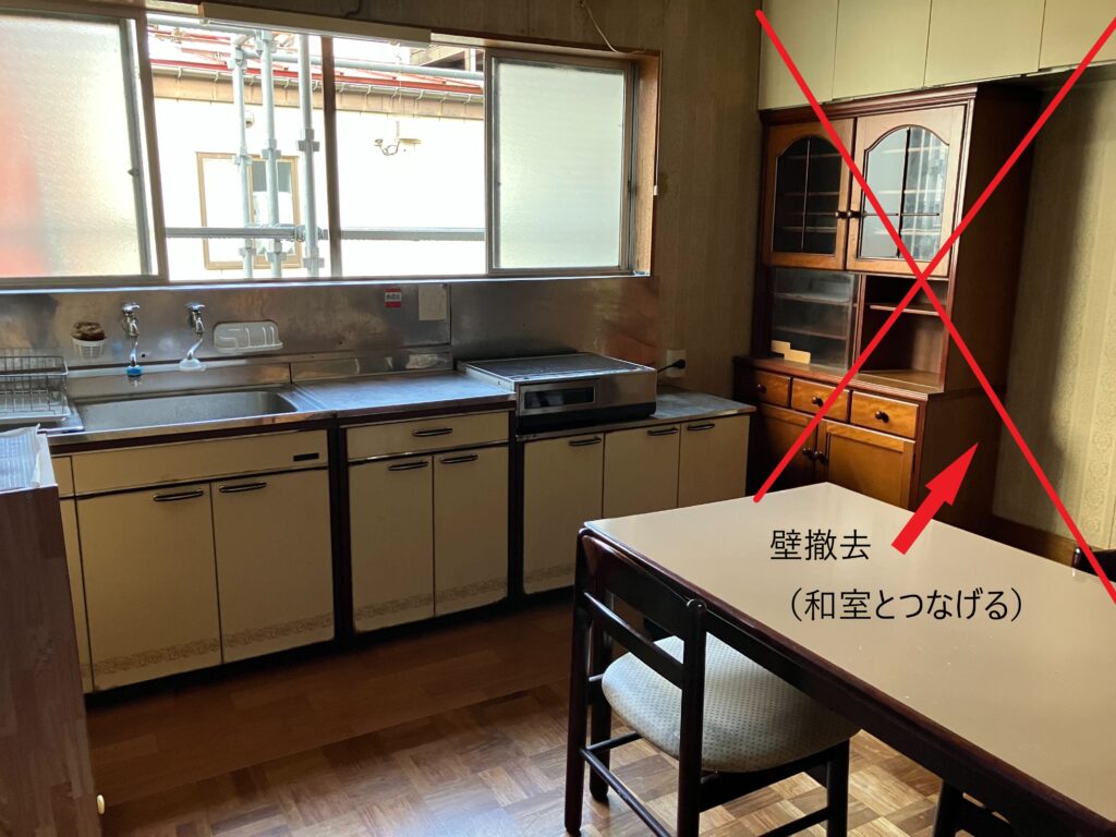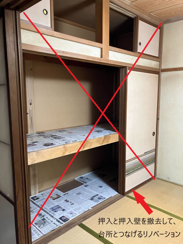 和室側からの写真。押入の奥に台所があります。この押入と壁を撤去します。