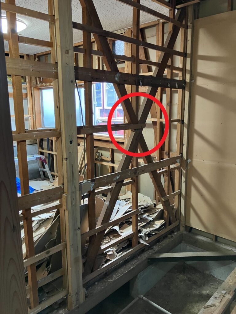 新築当初の図面があったので設計時から把握しておりましたが、押入壁には地震に抵抗する筋交いが施工されておりました。