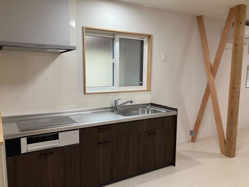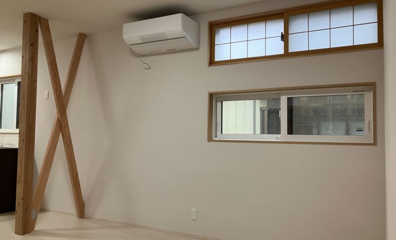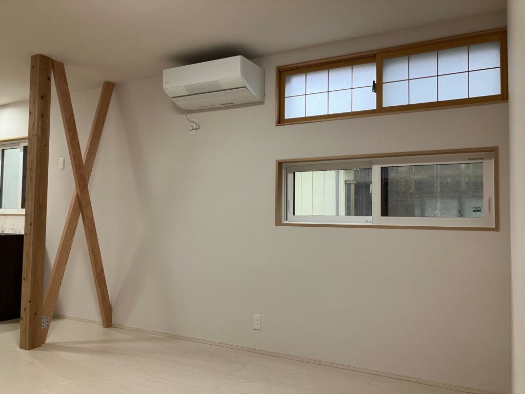 暖冷房がしっかりと循環するように筋交いは壁にせずに「あらわし」に。新しく柱を立てて、筋交いは切断せずに重ねて設置。耐力壁として存分な効果が発揮できます。