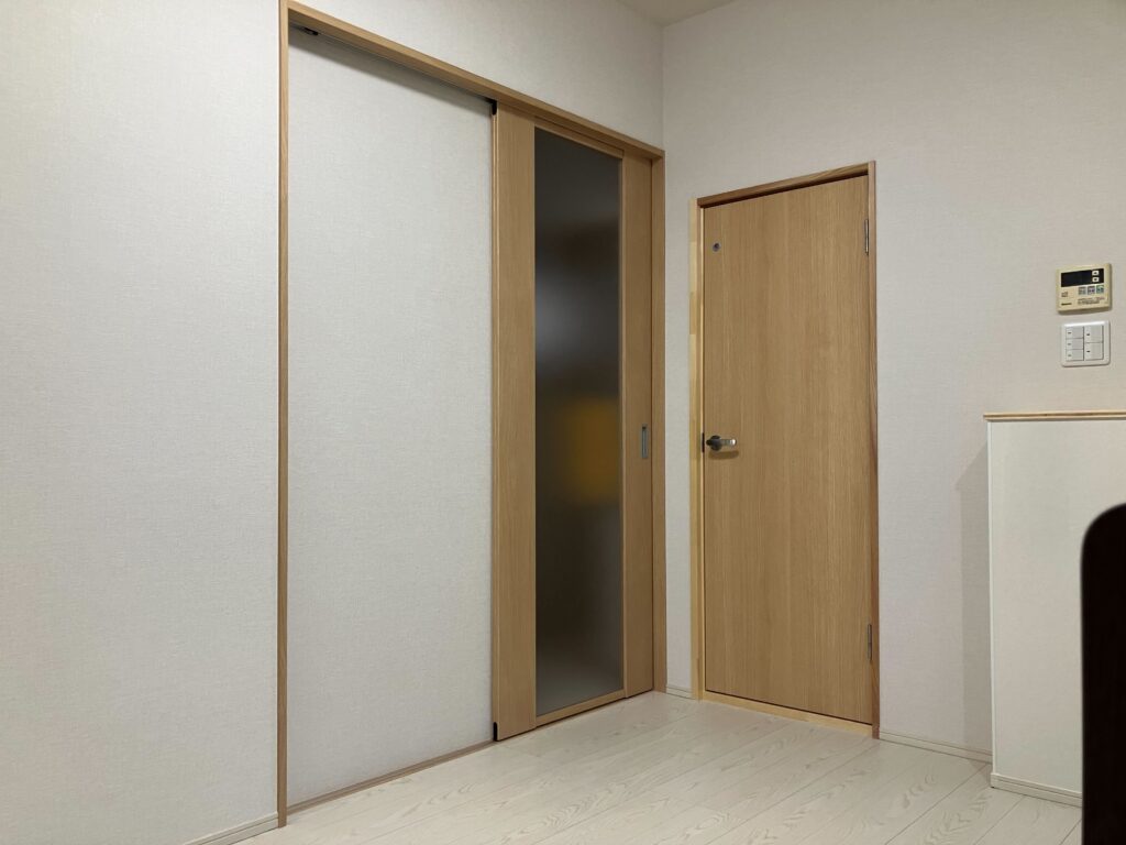 階段部分は断熱材を設置した壁に。引き戸を開けると階段室につながります。