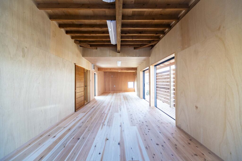・壁面の一部は、耐震要素となる構造用合板をそのままアラワシに。