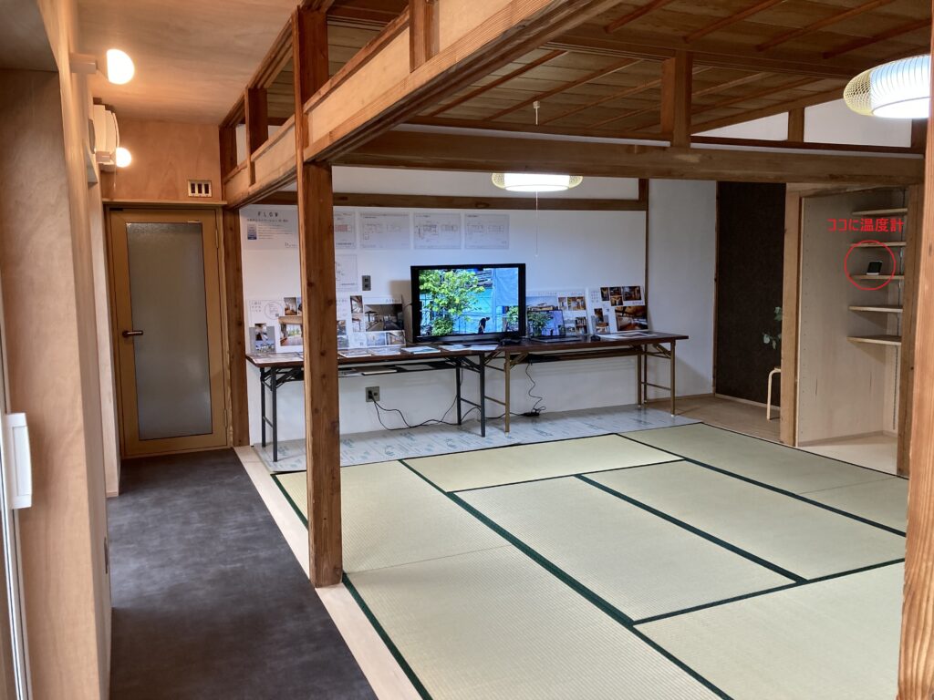 1階のキッチンに設置された壁掛けエアコンのみの暖房で、隣接する18帖の畳間の室温は21.7℃