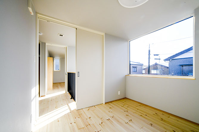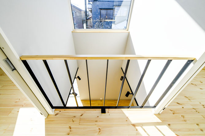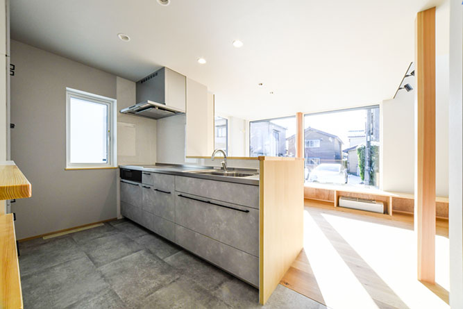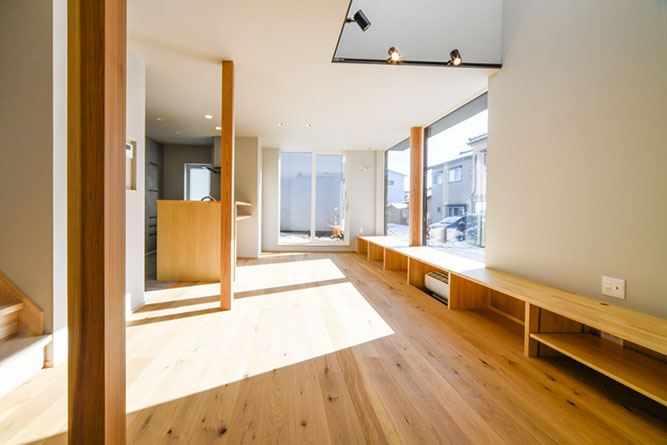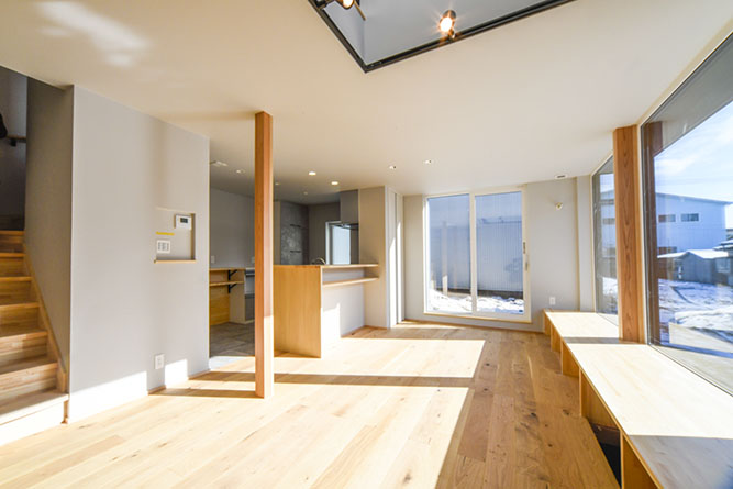 寒さとは無縁のぬくもりがたまる空間。居心地の良い場所には、自然と家族が集まりやすい様に「人のたまり」となるベンチを造りつけました。